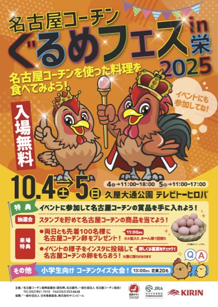名古屋の地鶏ブランド「名古屋コーチン」をテーマにしたグルメイベント「名古屋コーチンぐるめフェス IN 栄 2025」が久屋大通公園のテレビトーヒロバで開催されます。名古屋コーチンを使った料理や加工品が楽しめるほか、卵のプレゼント企画や抽選会、協賛店舗によるバラエティ豊かなブースが並びます。ご当地キャラクターも登場し、子どもから大人まで楽しめる内容。秋の名古屋で名古屋コーチンの魅力を存分に味わえる2日間です。